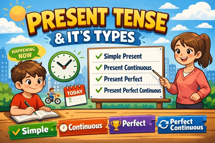 The present tense indicates actions happening now, routines, or general truths, divided into four forms: simple (I work), continuous (I am working), perfect (I have worked), and perfect continuous (I have been working). It primarily uses the base verb form, adding ‘-s’ for third-person singular subjects.